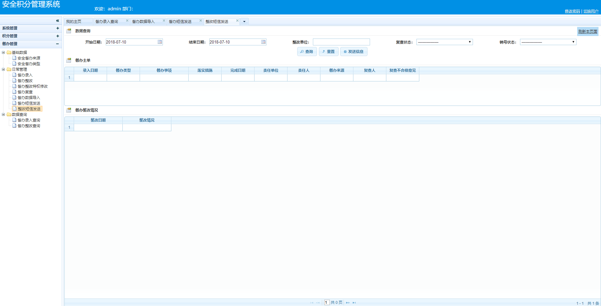针对矿区安全隐患通过系统此模块实现保留督办事务的录入、整改、复查一系列流程。对每个环节都进行短信通知。